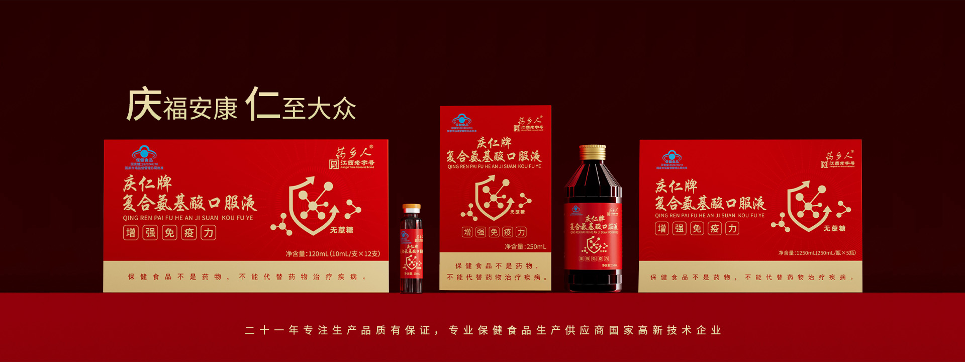 江西樟樹市慶仁保健品有限公司成立于2004年1月18號,注冊資金2600萬元,是一家專業致力于保健食品和營養食品研發(fā)、生產、銷售為一體的現代企業。公司現有保健品批文:藥鄉人牌黃芪當歸阿膠口服液。慶仁牌蛋白質粉,慶仁牌鈣鐵氨基酸口服液、慶仁牌牦牛骨茯苓山藥核桃維D顆粒、阿膠枸杞顆粒、復合氨基酸、西洋參淫羊霍酒、慶仁牌鹿茸人參酒、慶仁牌鈣維生素D咀嚼片、慶仁牌葡萄糖酸鋅口服液、葡萄糖鈣口服液、硒口服液,硒片等自有批文二十二個,正在申報的保健品批文十六個,同時擁有普通食品生產線、固體飲料其他飲料、配置酒、壓片糖、消殺劑生產線。我們的專業品質保證...